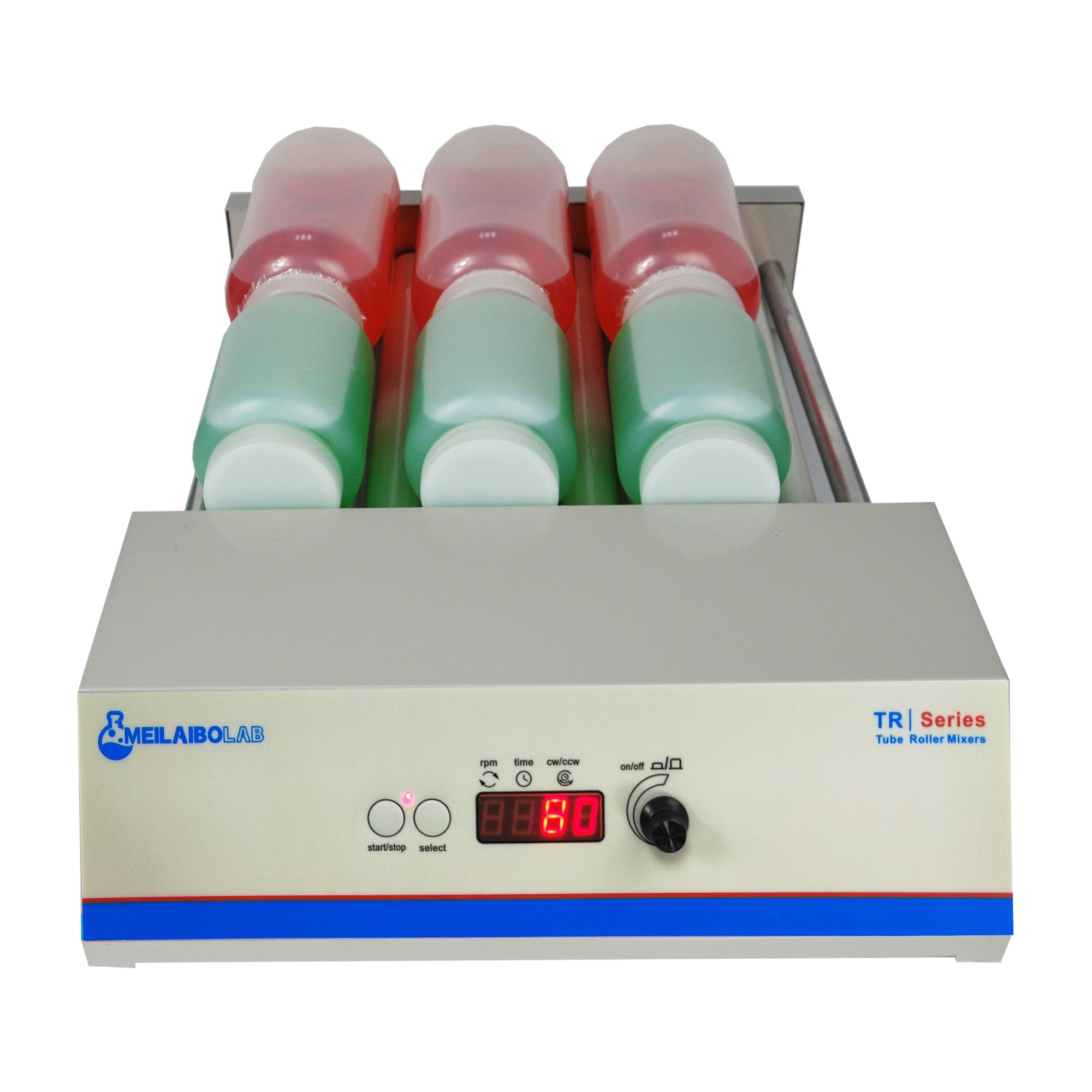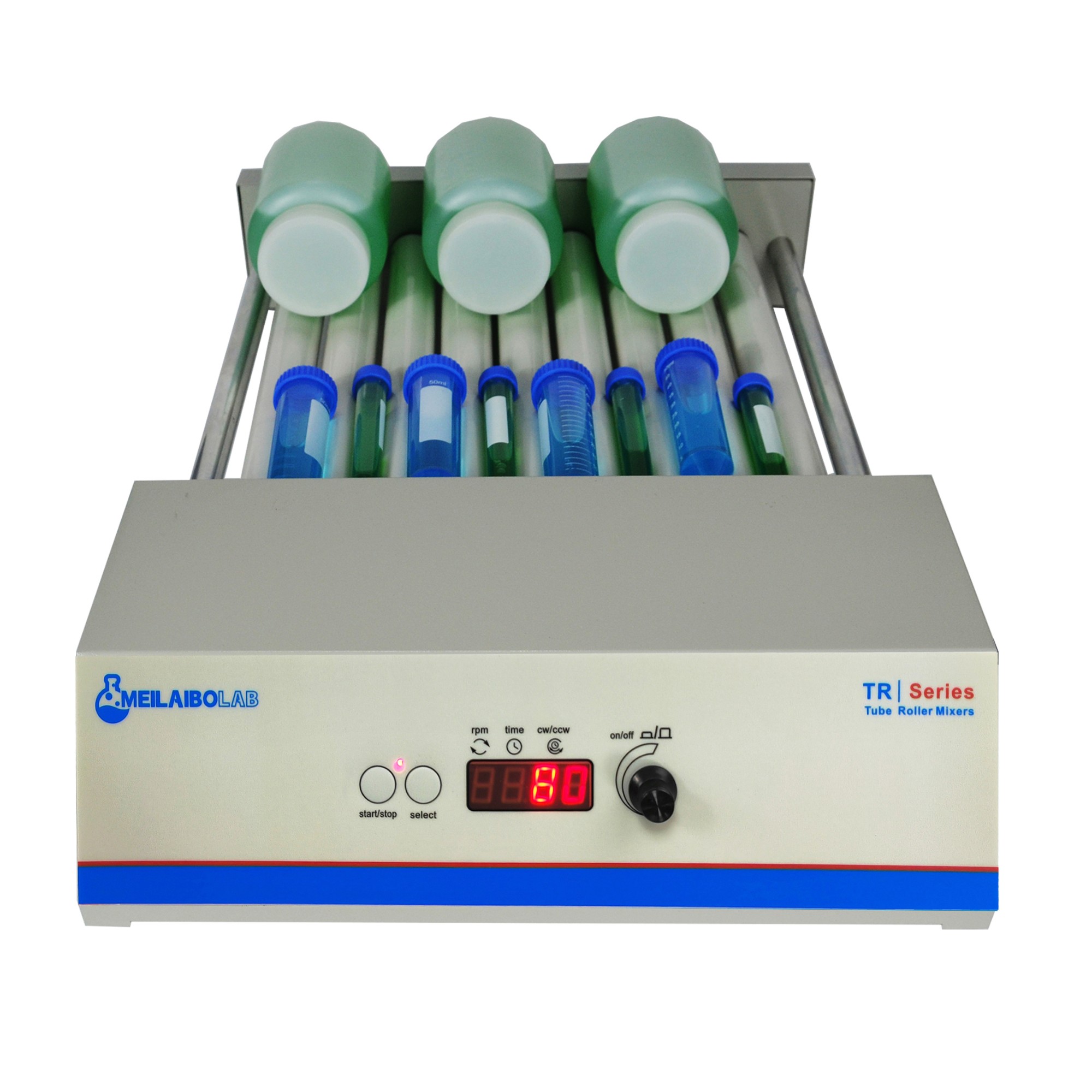 Roller mixer operates by rotating the rollers and cylindrical sample containers in opposite directions,