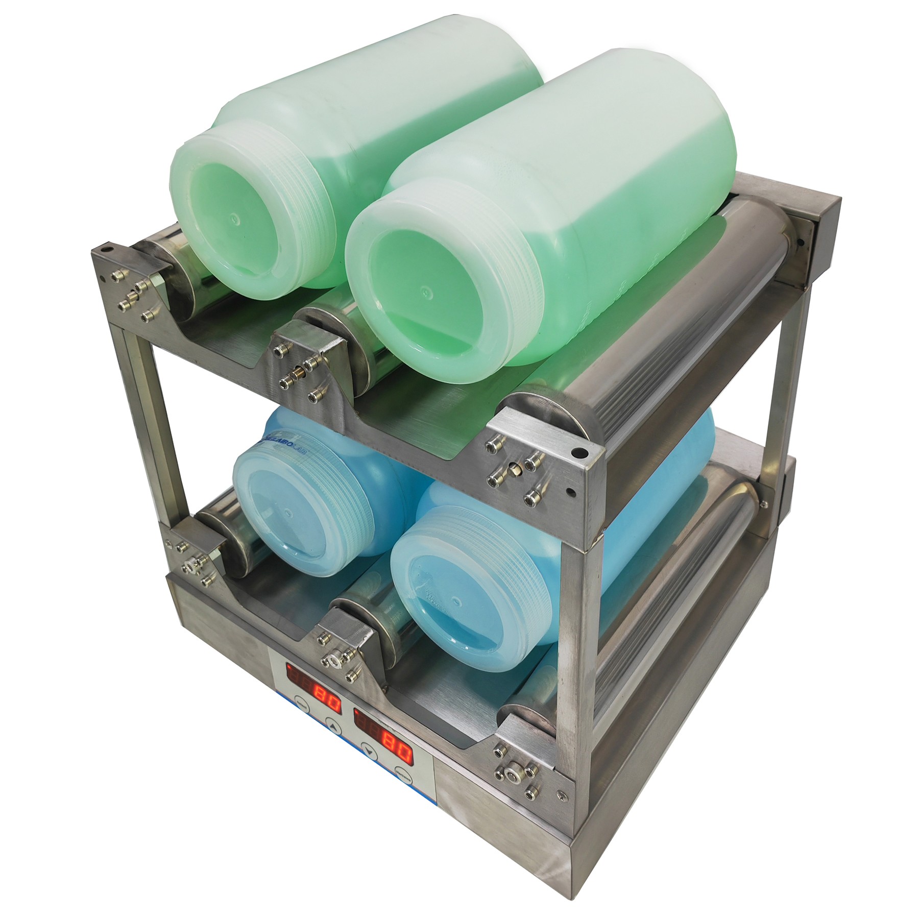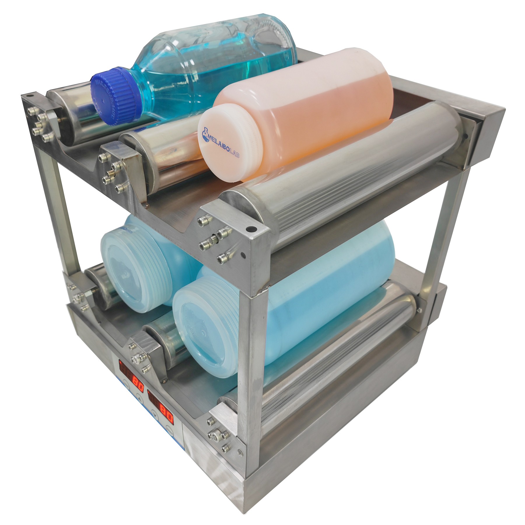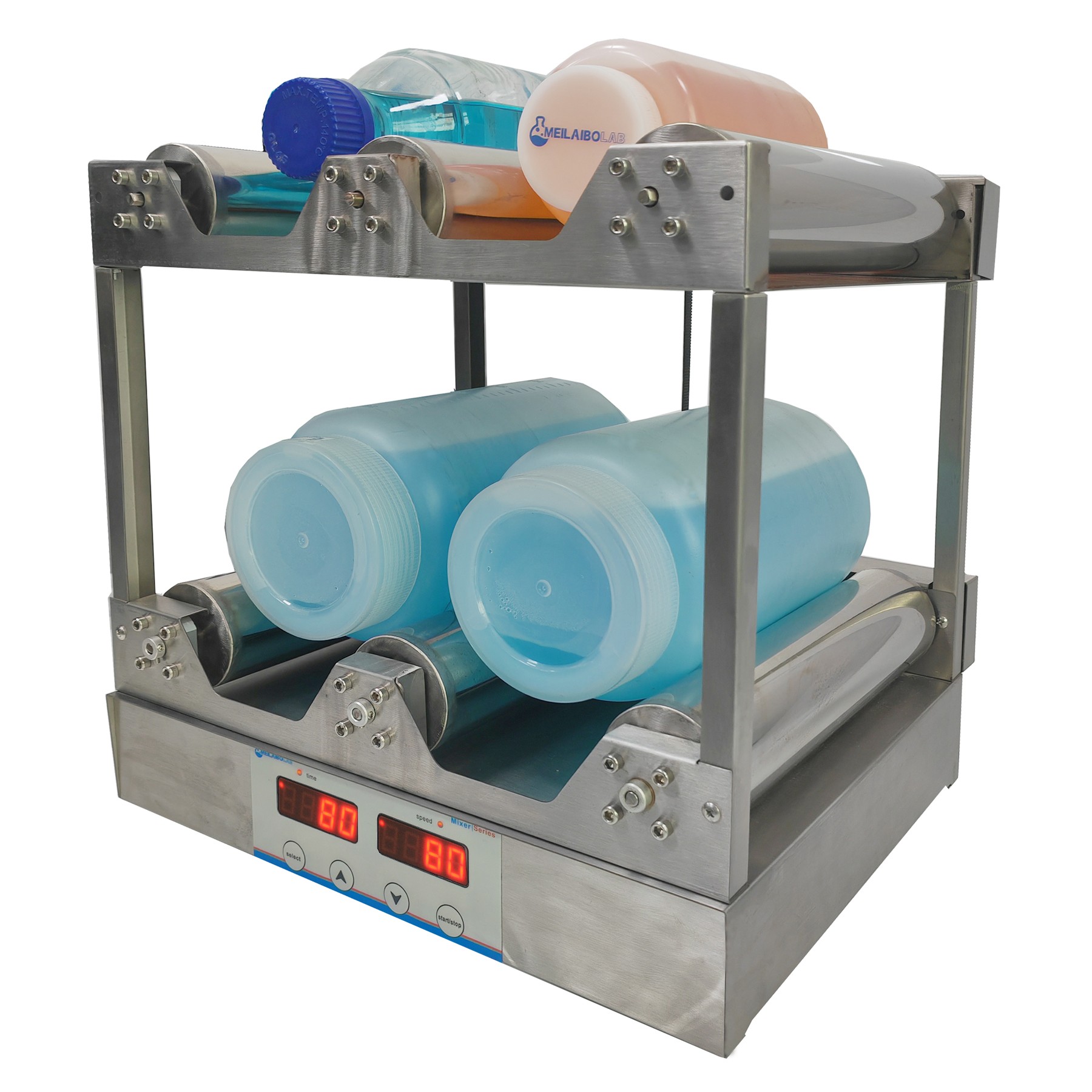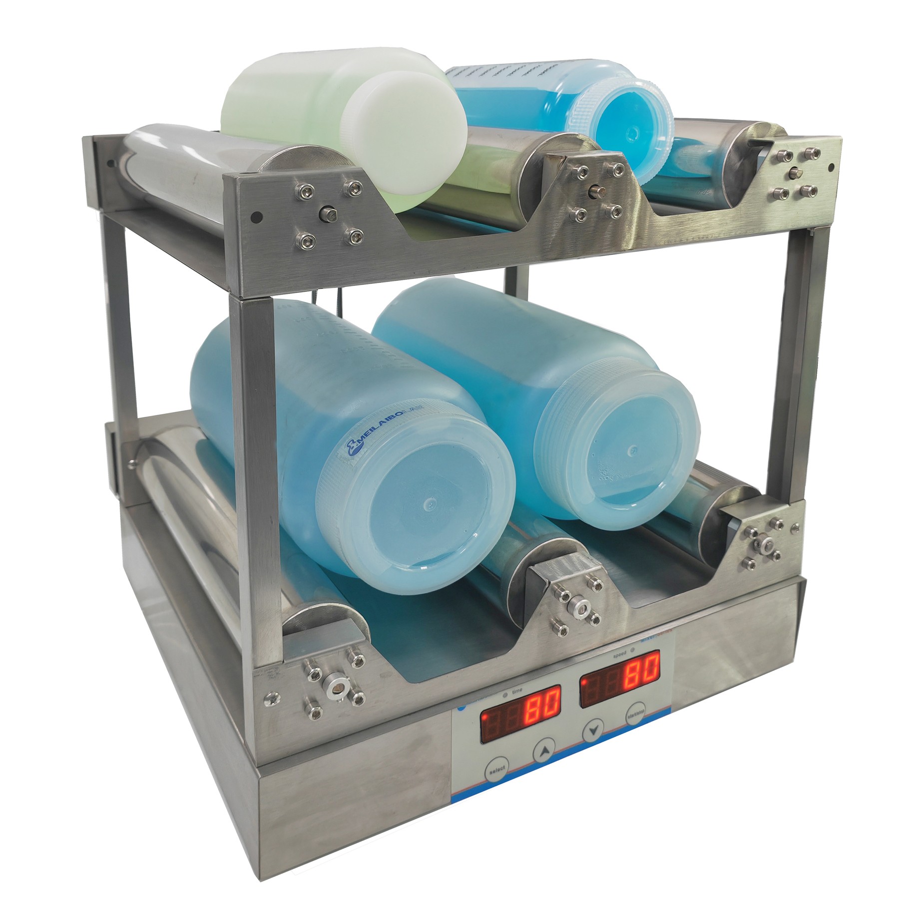 Rolling rocking mixer operates by rotating the rollers and cylindrical sample containers in opposite directions,